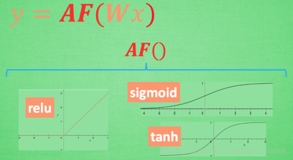 其实这个 AF, 掰弯利器, 也不是什么触不可及的东西. 它其实就是另外一个非线性函数. 比如说relu, sigmoid, tanh. 将这些掰弯利器嵌套在原有的结果之上, 强行把原有的线性结果给扭曲了. 使得输出结果 y 也有了非线性的特征. 举个例子, 比如我使用了 relu 这个掰弯利器, 如果此时 Wx 的结果是1, y 还将是1, 不过 Wx 为-1的时候, y 不再是-1, 而会是0.