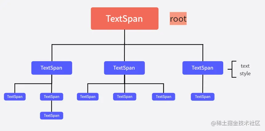 树中的每一个TextSpan都包含text和style,其中的style是文本样式,如果没有设置某一个节点的样式,那么它会继承父节点中的样式。若根节点也没有自定义样式,那么就会采用默认的样式值。