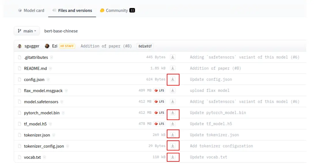 本节中使用transformers框架调用bert-base-chinese预训练模型,登陆Huggingface官网手动下载到本地
