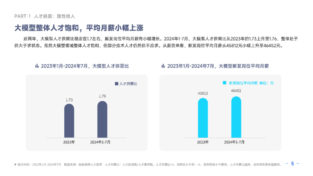 人才饱和与薪资:大模型整体人才饱和,但平均月薪小幅上涨,显示出市场对人才的持续需求。
