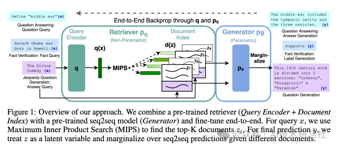 论文提到:将预训练的检索器(查询编码器 + 文档索引)与预训练的 seq2seq 模型(生成器)相结合,并进行端到端微调。对于查询 x,我们使用最大内积搜索 (MIPS) 来查找前 K 个文档 z。对于最终预测 y,我们将 z 视为一个潜在变量,并在给定不同文档的情况下对 seq2seq 预测进行边缘化。
