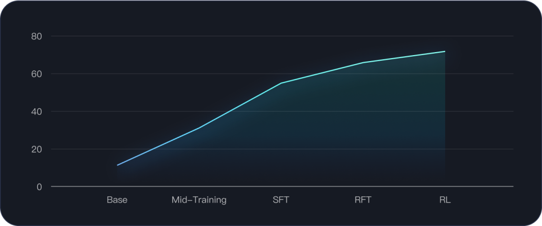 中期训练:在当前阶段(例如在SWE-bench等排行榜上)增加工具使用能力、多轮交互和指令遵循的广泛训练可能不会带来显著的性能提升。但由于实验基于 Qwen3-32B 模型,团队发现增强这些基础能力将对后续的SFT和RL阶段产生重要影响。这表明提升此类核心能力能够深刻影响模型处理更复杂任务的能力。