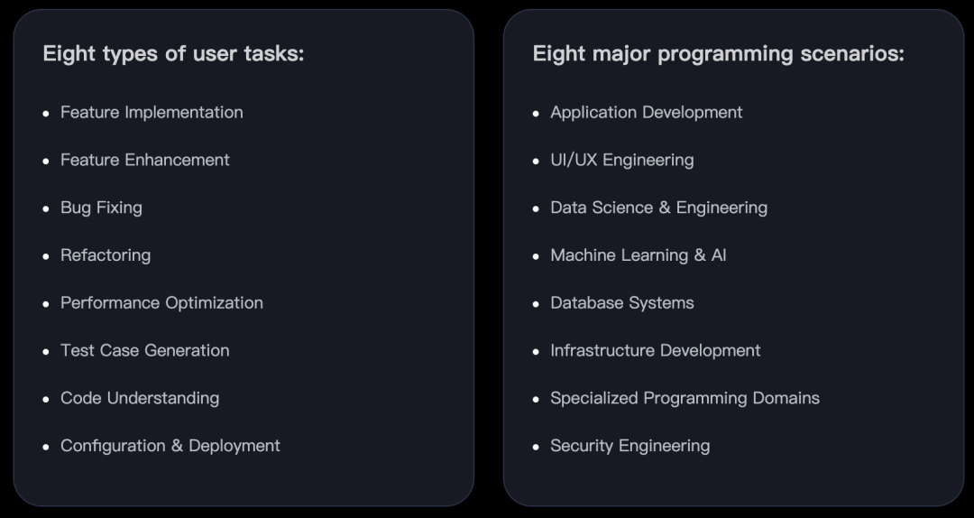SFT & RFT:精心设计了八种任务类型和八种编程场景,以确保模型的泛化能力和综合性能。此外,在RL 阶段之前,创新性地引入了RFT阶段。与传统RL相比,在训练中融入了由工程师标注的"教师轨迹"作为指导——正如新手驾驶员在正式上路前需要教练陪同练习。这一步骤不仅提升了模型性能,还进一步稳定了后续的RL训练。