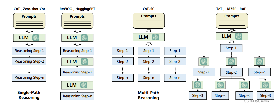 Planning模块可以是两种结构,一种是Single-Path,这里引入CoT的概念(Chain of thought),可以要求LLM基于任务一步步推理,形成一个解决方案。每一步推理后产出的内容可以再次输入给LLM去判断下一步如何走。