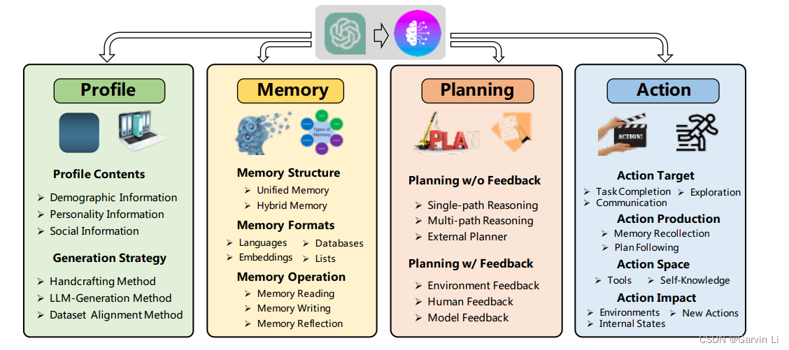 如果要实现以LLM为Base的Agent,主要需要从两个角度思考问题,(1)如何设计一种架构可以更高效的应用LLM(2)如何让Agent具备解决不同任务的范化能力,当然这个也依赖于LLM。目前行业里通常通用的一种架构是由Profile、Memory、Planning、Action所构建的四级架构。