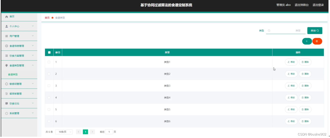 食谱类型管理,在食谱类型管理页面中可以对索引、类型等信息进行修改或删除等操作,如图5-11所示。