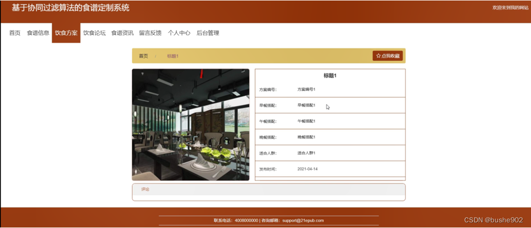 饮食方案,在饮食方案页面中可以查看标题、方案编号、早餐搭配、图片、午餐搭配、晚餐搭配、适合人群、发布时间等信息,并进行评论或收藏等操作;如图5-3所示。