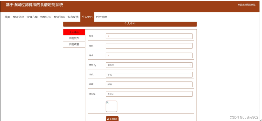用户注册,在用户注册页面通过填写账号、密码、姓名、手机、邮箱、身份证等信息完成用户注册,如图5-4所示。在个人中心页面通过填写账号、密码、姓名、性别、手机、邮箱、身份证、图片等信息完成个人信息更新操作;还可以根据需要对我的发布,我的收藏进行相对应操作;如图5-5所示。