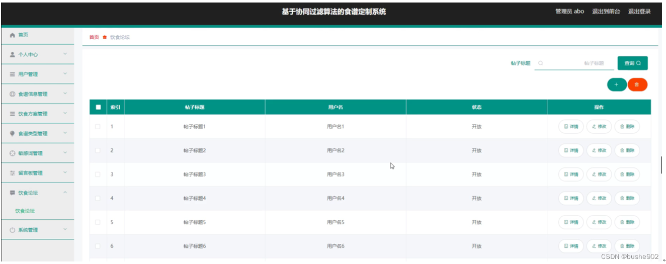 饮食论坛,在饮食论坛页面中可以对索引、帖子标题、用户名、状态等信息进行详情、修改、回复或删除等操作,如图5-14所示。
