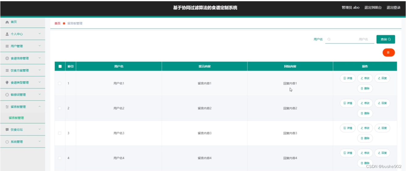 留言板管理,在留言板管理页面中可以对索引、用户名、留言内容、回复内容等信息进行详情、修改、回复或删除等操作,如图5-13所示。