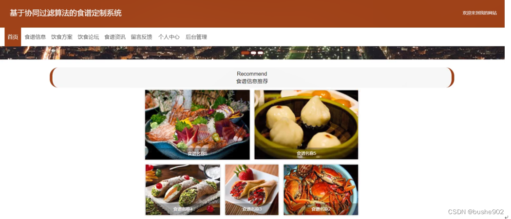 基于协同过滤算法的食谱定制系统,在系统的首页可以查看首页、食谱信息、饮食方案、饮食论坛、食谱资讯、留言反馈、个人中心、后台管理等信息进行详细操作,如图5-1所示。