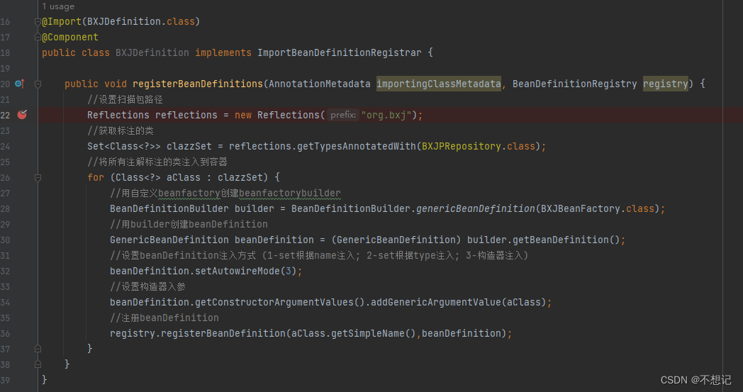 自定义ImportBeanDefinitionRegistrar,此类用于创建beanDefinition,并将创建的definition注册到spring的BeanFactory中,用于后续创建bean。这里注意一下28行传入的是自定义的factoryBean而不是bean本身,是因为这段逻辑支持factorybean去返回bean