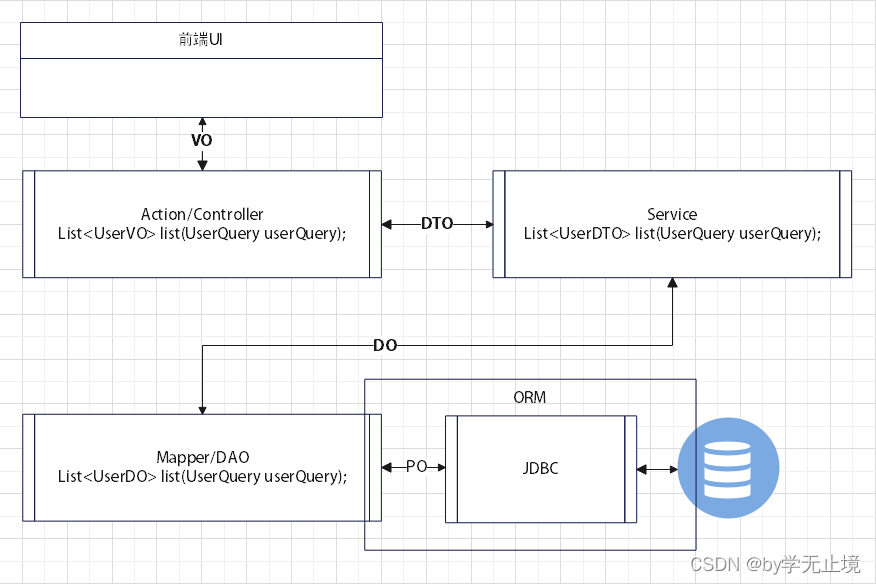 - DTO(Data Transfer Object):数据传输对象,用于服务层与持久层之间的数据传输对象,代表服务层需要接收/返回的数据。