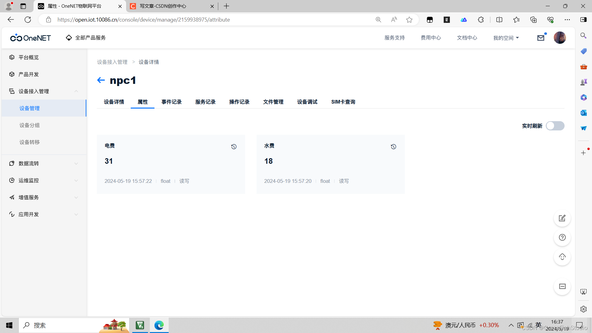 如果我们npc1设备下还有一个dianfei属性,我们既上传水费也上传电费,则JSON格式数据可以是如下: