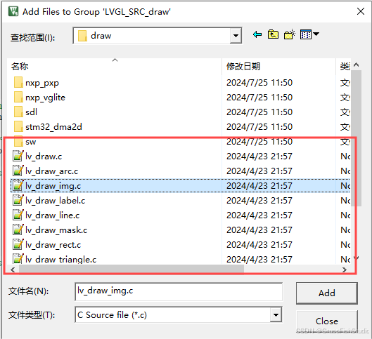 加入src/draw文件夹里面的sdl和stm32_dma2d文件夹中的所有c文件