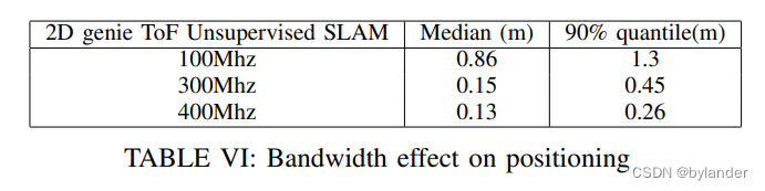 降低带宽:我们还研究了降低带宽对2D神经SLAM精度的影响。像MUSIC这样的特征提取算法随着带宽的减少而解析出更少的多径。这影响了我们的定位网络在从环境中采样新的CSI时的性能,当训练在提取的ToF上时,优化可能会陷入局部最小值。