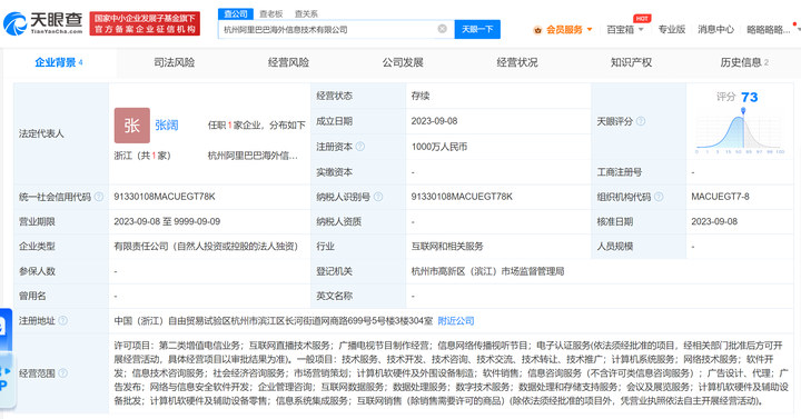 天眼查App显示,近日,杭州阿里巴巴海外信息技术有限公司成立。