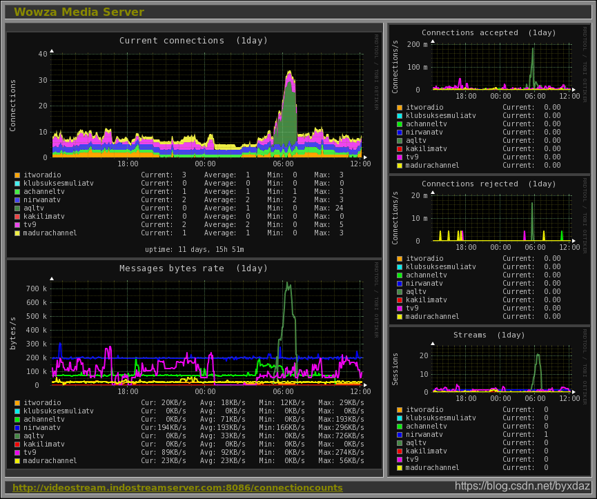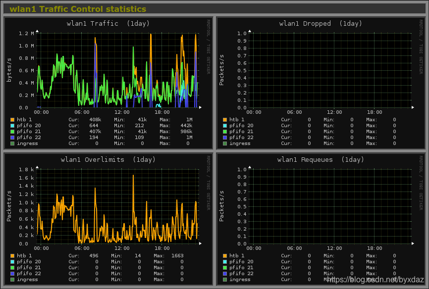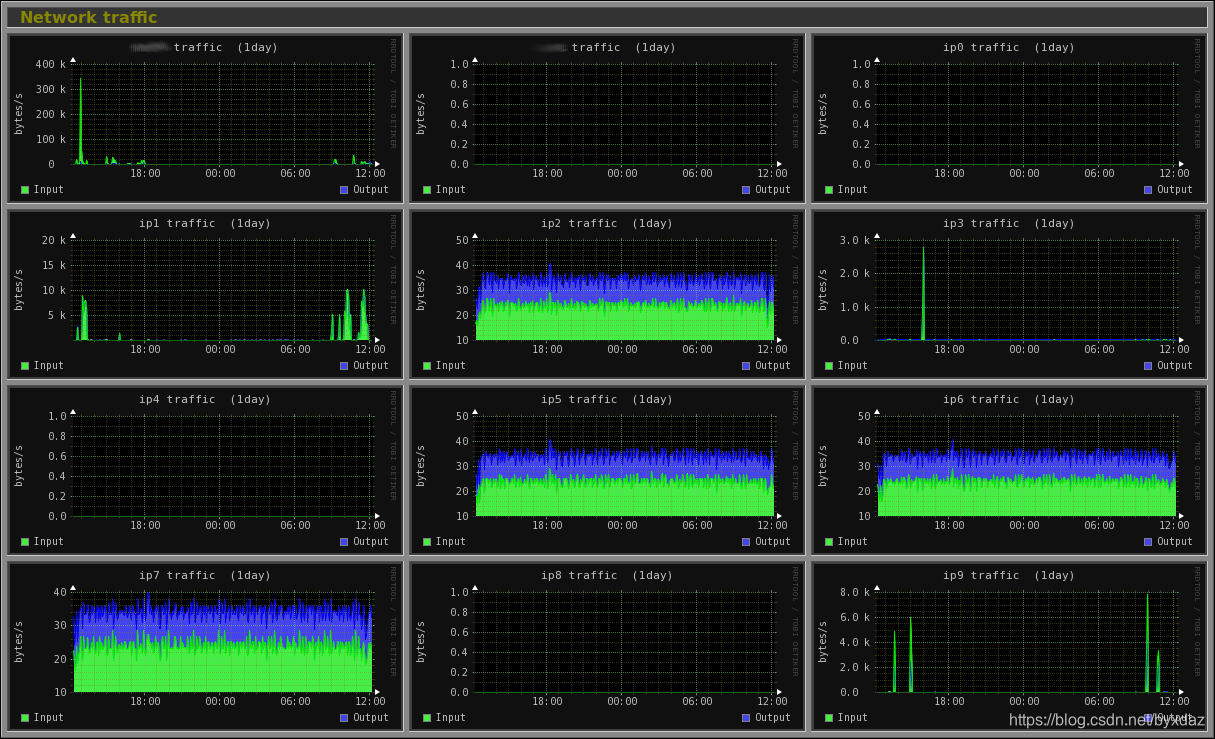 Monitorix installed on a network gateway server showing Internet activity graphs of 12 devices.
