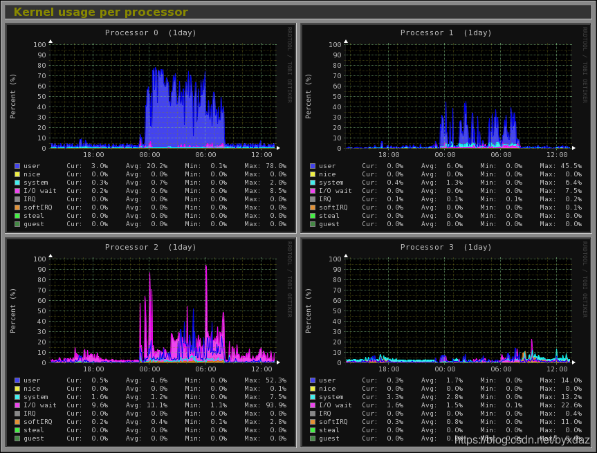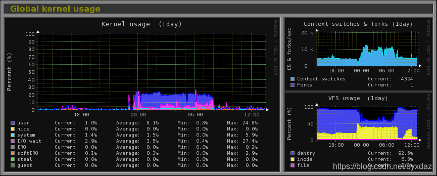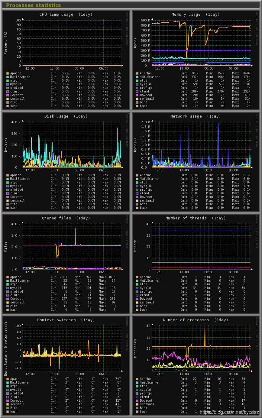 监测系统负载平均数值、活动进程、每个处理器的内核使用情况、全局内核使用情况和内存分配情况。
