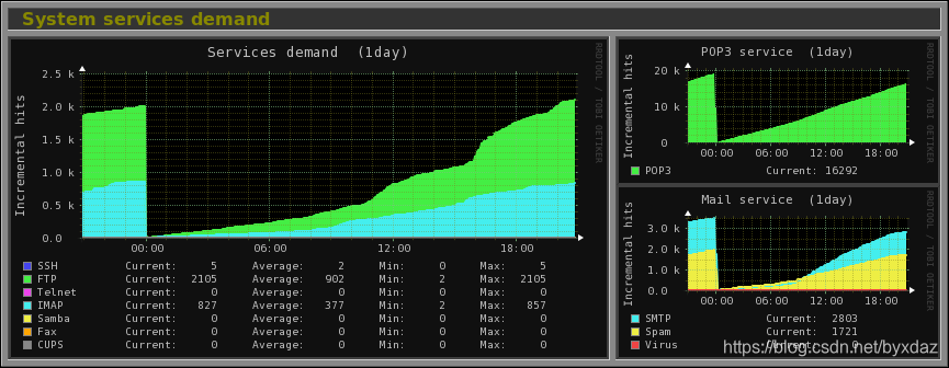 监测众多系统服务,包括SSH、FTP、Vsftpd、ProFTP、SMTP、POP3、IMAP、POP3、VirusMail和Spam。