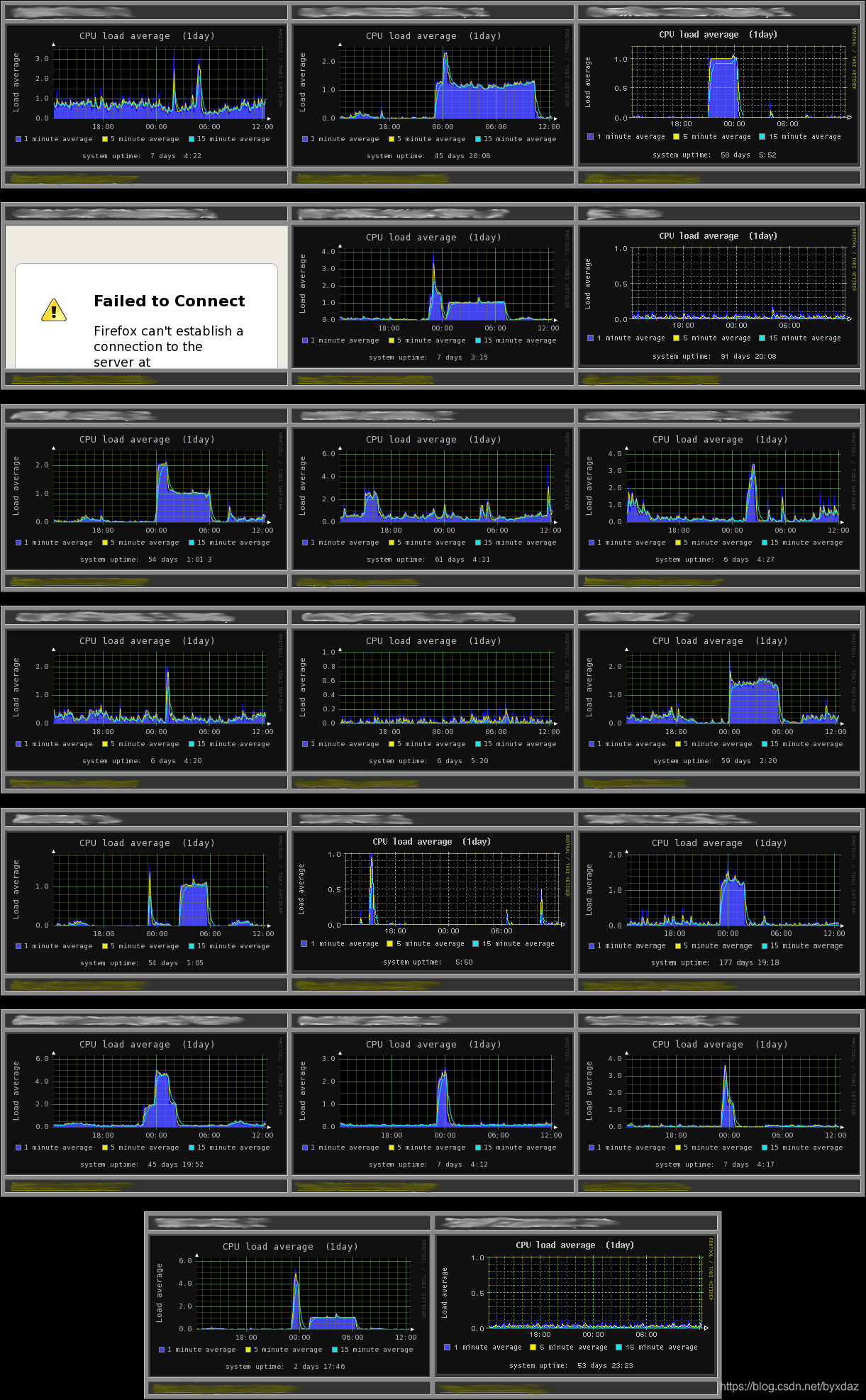 System load average of 20 remote GNU/Linux servers using Multihost view (with one of them down).