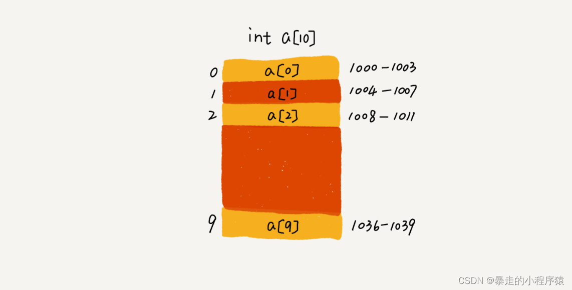 拿一个长度为 10 的 int 类型的数组 int[] a = new int[10] 来举例。在下图中,计算机给数组 a[10],分配了一块连续内存空间 1000~1039,其中,内存块的首地址为 base_address = 1000。