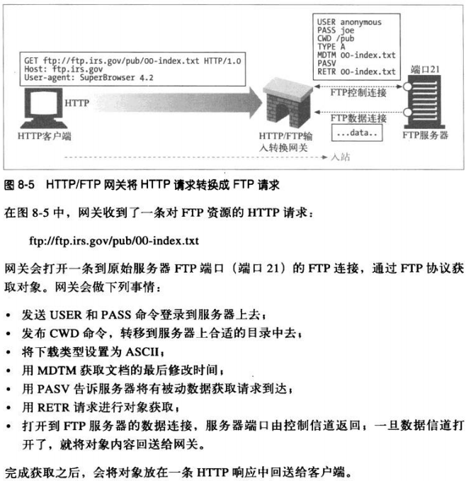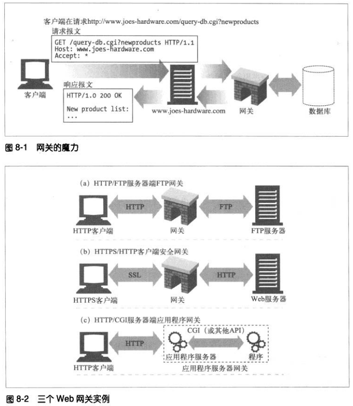 网关(gateway)是一种特殊的服务器,作为其他服务器的中间实体使用。通常用于将HTTP流量转换成其他的协议。网关接受请求时就好像自己是资源的源端服务器一样,客户端可能并不知道自己在与一个网关进行通信。