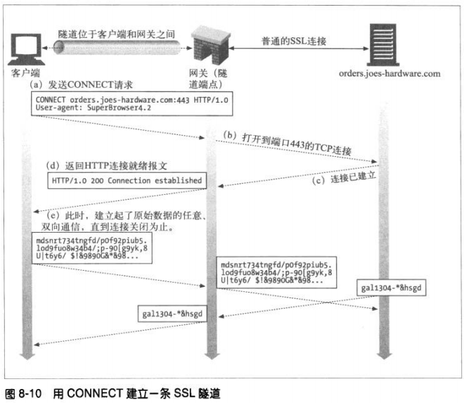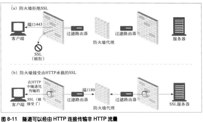 HTTP隧道一种常见用途是通过HTTP连接承载加密的安全套接字层(SSL,Secure Sockets Layer)流量。这样SSL流量就可以穿过只允许WEB流量通过的防火墙了。