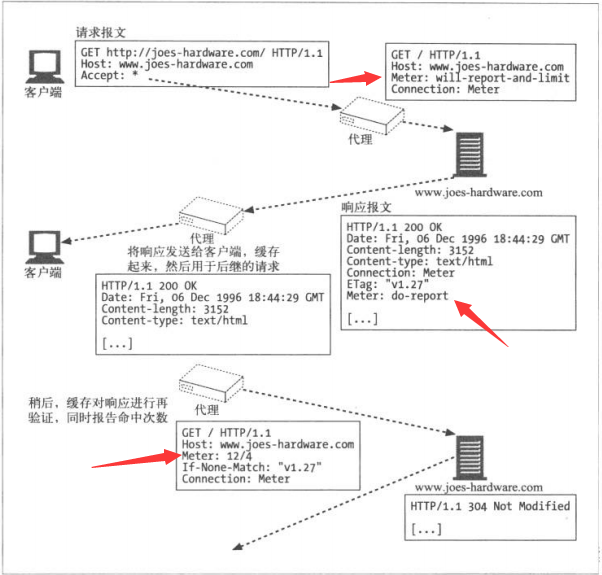 通过Meter首部,缓存和服务器在相互间传输与用法和报告有关的指令。这与Cache-