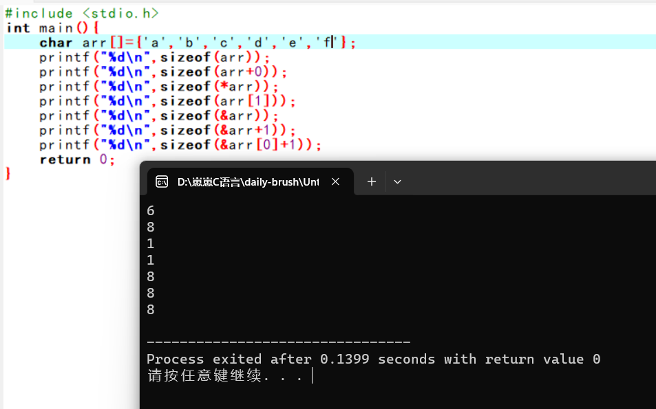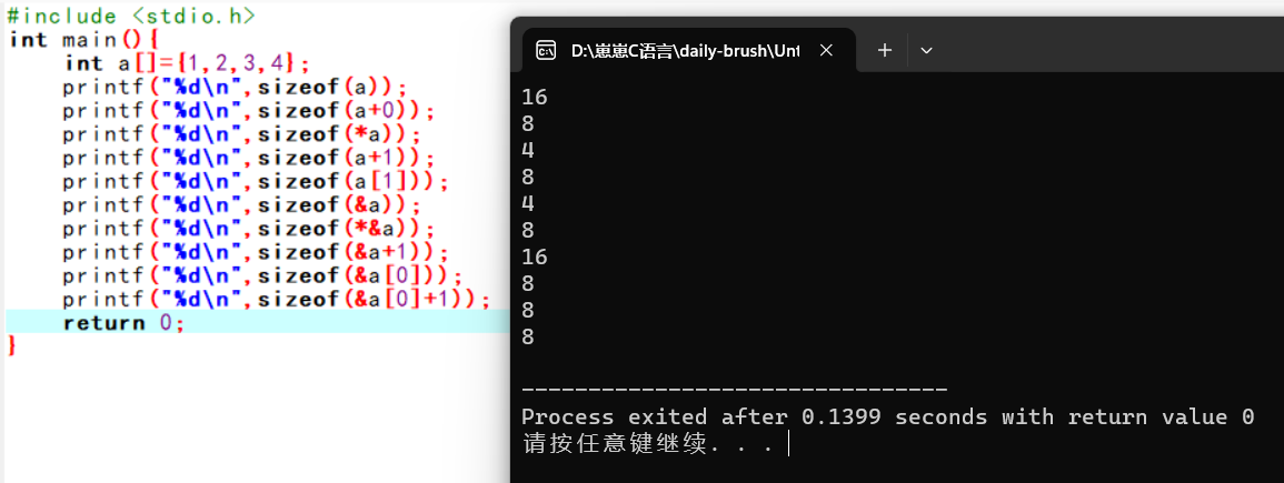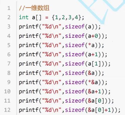8.&数组名+1,指针跳过整个数组,但这个表达式依然是地址,sizeof计算的依然是地址的大小。答案是4/8