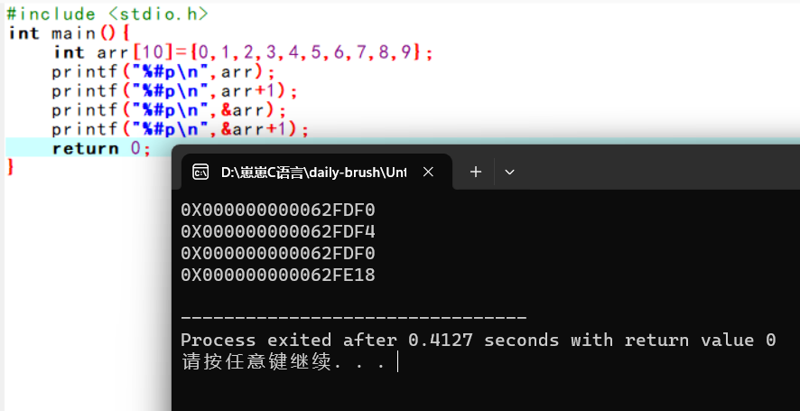 我把&数组名和数组名单独列一个标题也说明了它们的重要性。搞清楚了上面所讲的东西,理解下题就会相对容易一些。