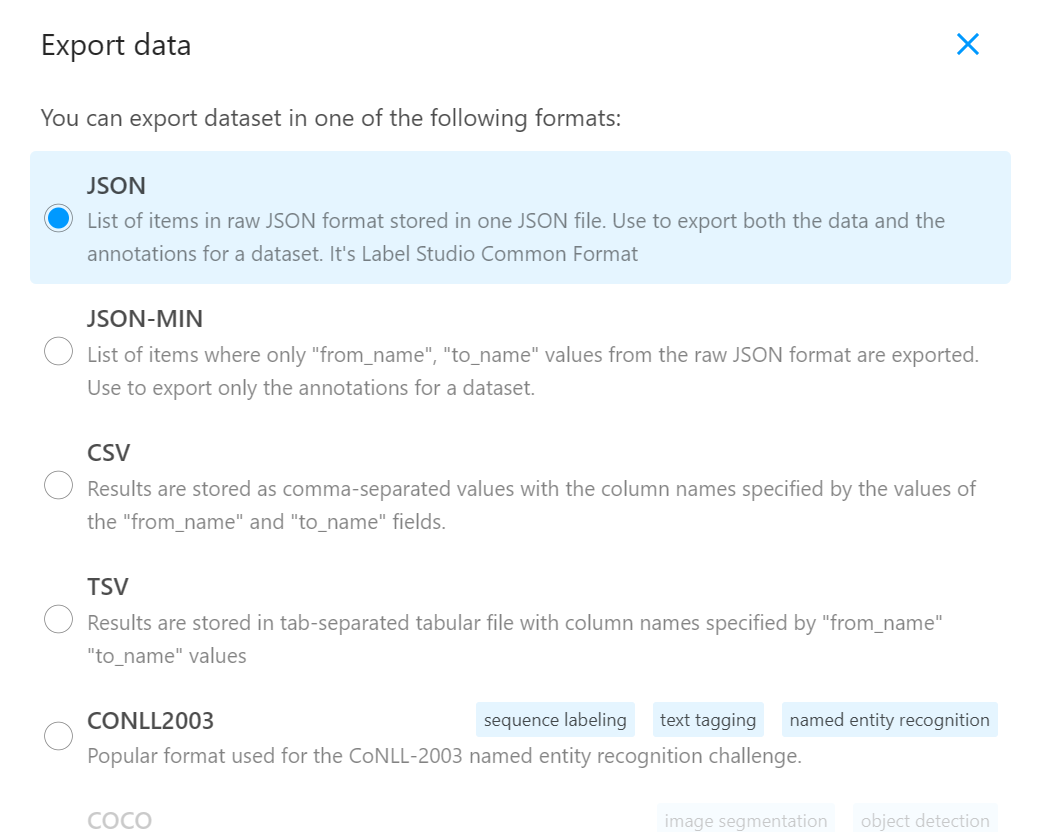 label-studio的数据导出比较清楚,基本涉及各种格式,如果只需要导出BIO标注的,可以选择CSV导出,代码参考命名实体识别(NER)标注神器——Label Studio 简单使用