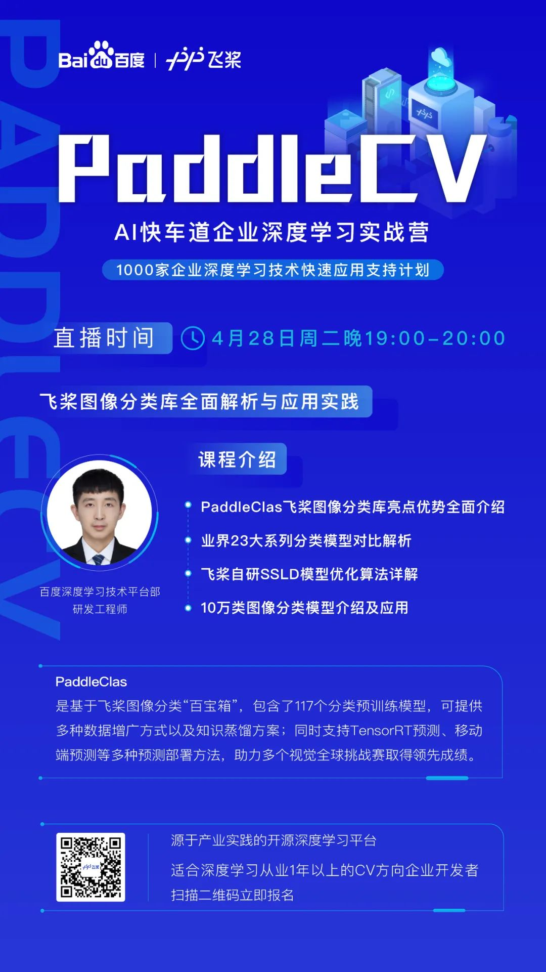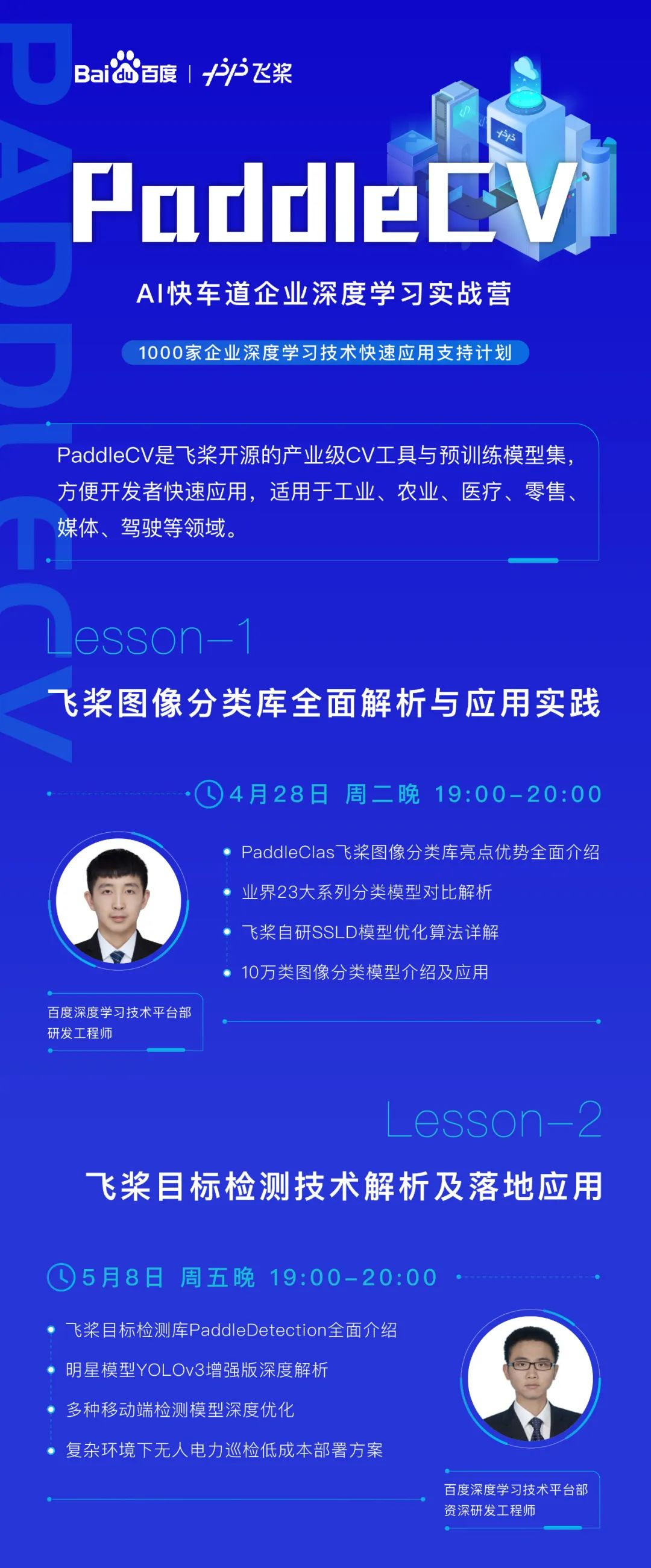 在图像分类这一基本问题后,百度AI快车道还将于5月初免费连续带来目标检测、图像分割、OCR技术、飞桨模型压缩库核心技术等课程分享,不仅有前沿技术理论讲解、开发套件及明星模型的介绍,还有包括真实落地案例的分析解读,真正打通理论到落地的快速应用通道。百度技术大咖亲自带队,从多角度为广大开发者“划重点”, 手把手教大家“破解”计算机视觉领域遇到的应用难题。百度AI快车道PaddleCV专题课程每场直播时间均为19:00-20:00,跟着技术大咖在CV领域一“战“到底!