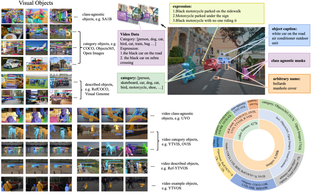 GLEE 使用的数据根据标注类型可以分为四大类:1)基于词表的目标检测数据集,如 COCO、Objects365;2)基于目标描述的 grounding 数据集,如 RefCOCO 系列、VisualGenome;3)无类语义信息的 open-world 数据集,如 SA1B、UVO;4)视频数据,如 YouTubeVIS、OVIS。GLEE 所使用的图片超过 1 千万,其中标注目标数量超过一亿五千万。