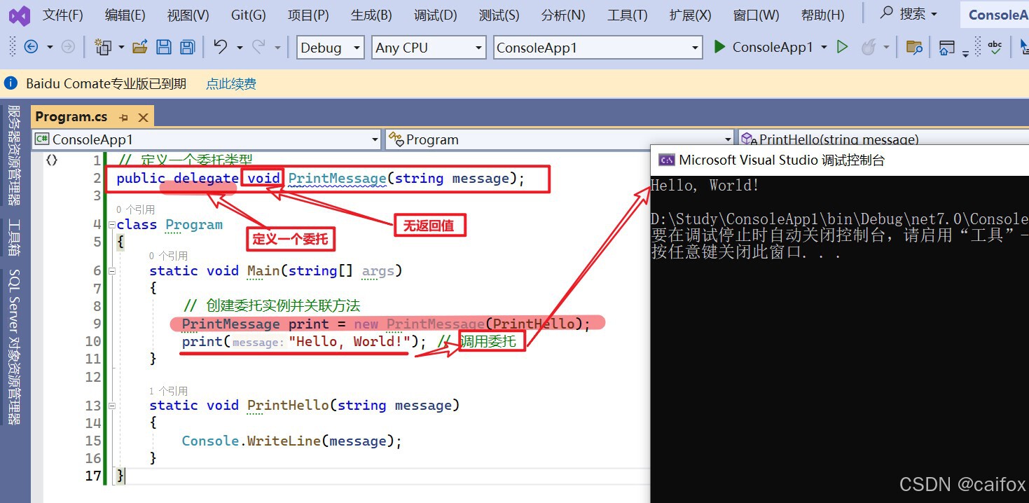 - 类型安全:委托是强类型的,这意味着你可以确保传递给委托的方法与委托的签名相匹配。