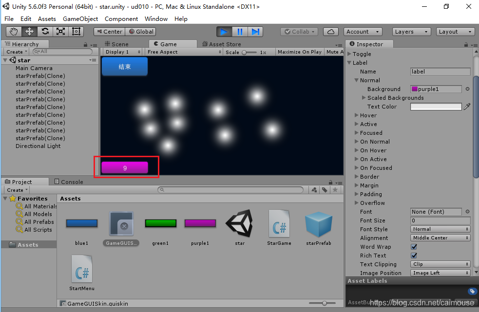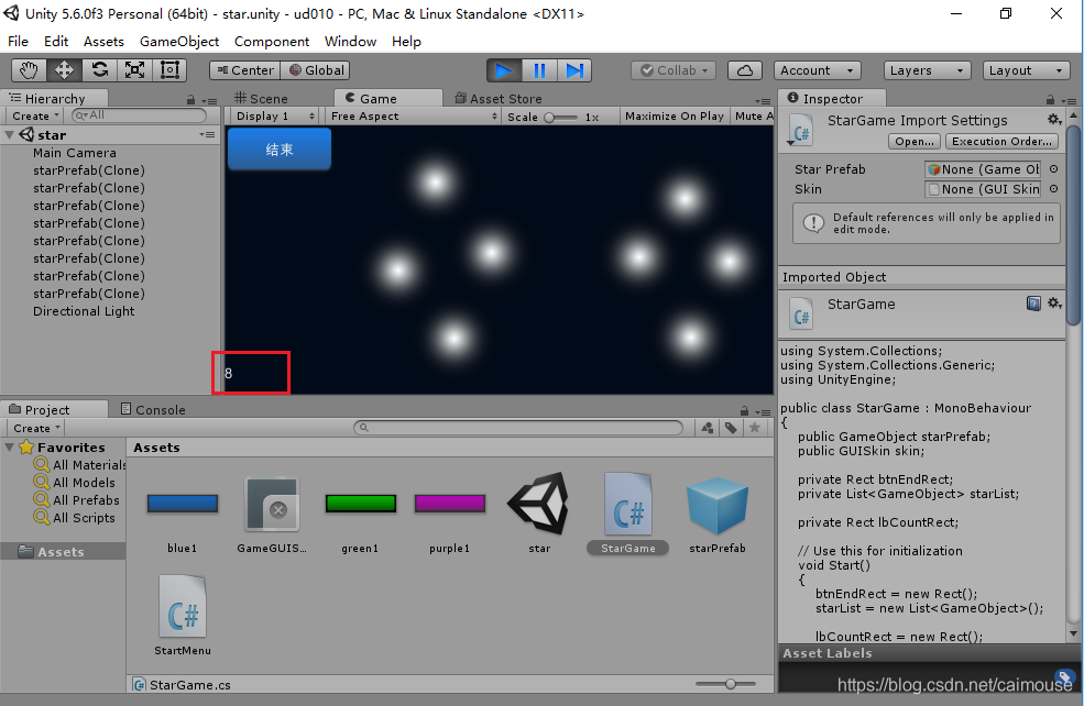 到这里,就把星星游戏的创建过程完全做完了。在这个过程里,经历界面文本显示、按钮显示、自定义按钮、自定义的界面样式管理、创建星星的预制件、游戏开始菜单、游戏开始菜单切换到游戏循环、退出游戏循环返回开始菜单,把这些学完之后,就可以自己去尝试不同的小游戏开发了。