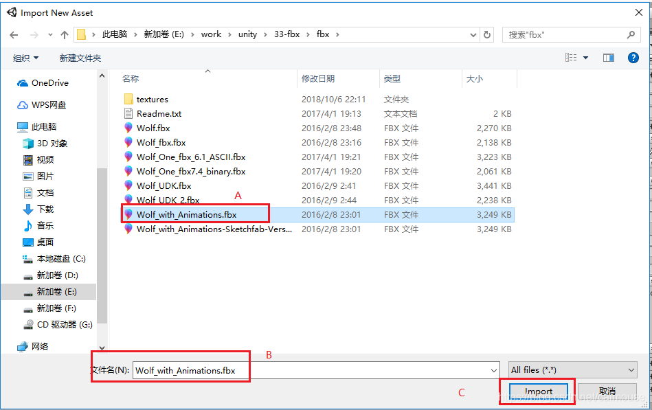 先在A处选择文件,在B处确认是否自己需要导入的文件,最后在C处点击导入,就可以把这个fbx动画导入到工程里了,如下图: