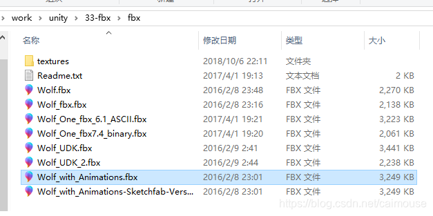 这个文件从网站https://free3d.com/3d-model/wolf-rigged-and-game-ready-42808.html里下载的,解压之后就可以看到上面的文件,我们主要使用Wolf_with_Animations.fbx文件,这个是带有动画的fbx文件。
