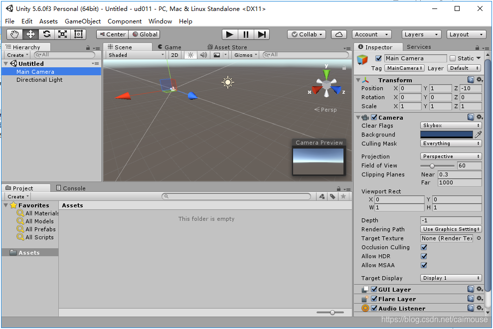 上图就是创建一个空的unity3d的缺省3D工程,里面有一个摄像机和一个方向光。