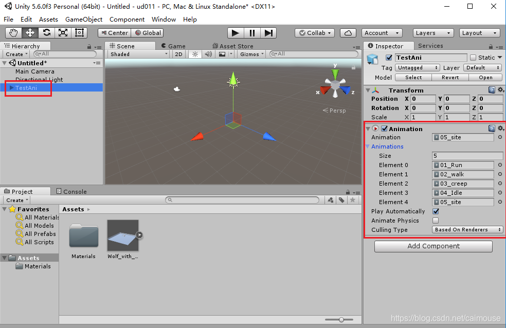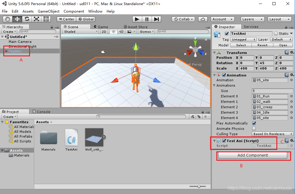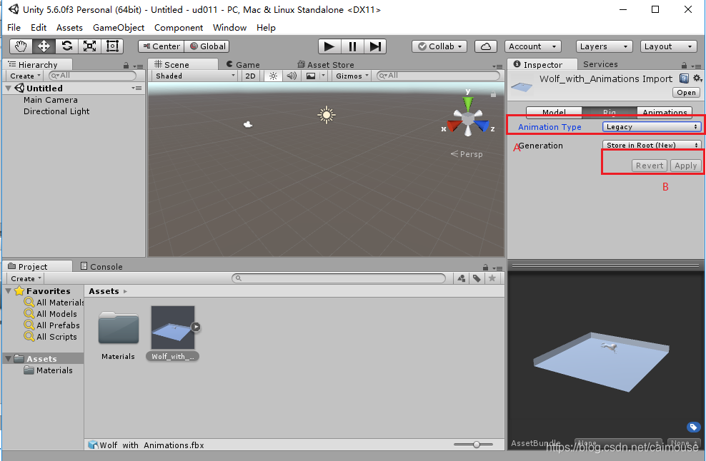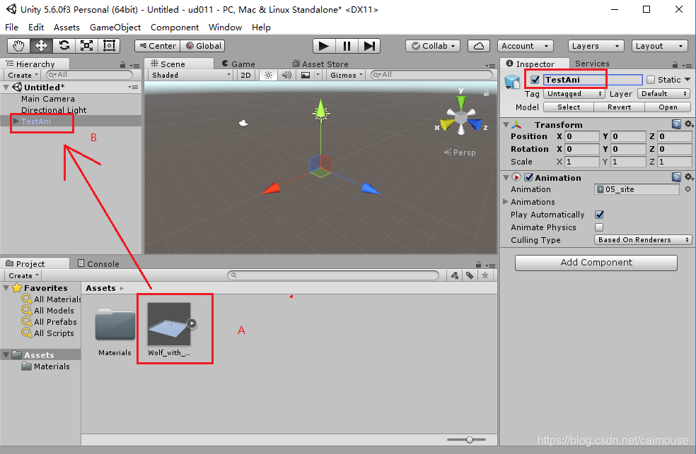这里可以看到已经是旧动画了,并且在B处点击应用Apply。这样修改动画的类型已经完成,接着下来,就是把这个动画拖放到场境里,并把它命名为TestAni,如下图: