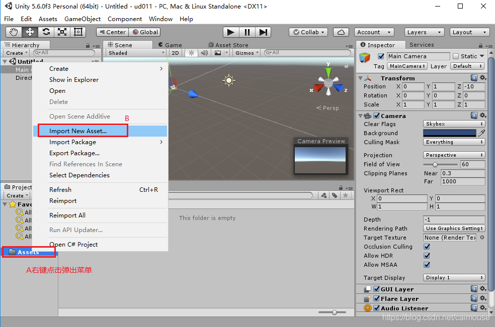在A处的Assets点击鼠标右键,就可以弹出上面的菜单,然后选择Import New Asset...,就会弹出下面的窗口: