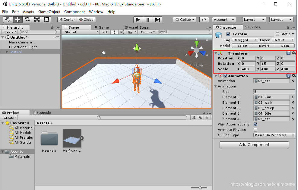 从这里可以看到动画有5个状态,可以根据需要选择播放不同的动作。但是这个游戏模型太小了,在场境里看不到,先把它放大一下,如下图设置: