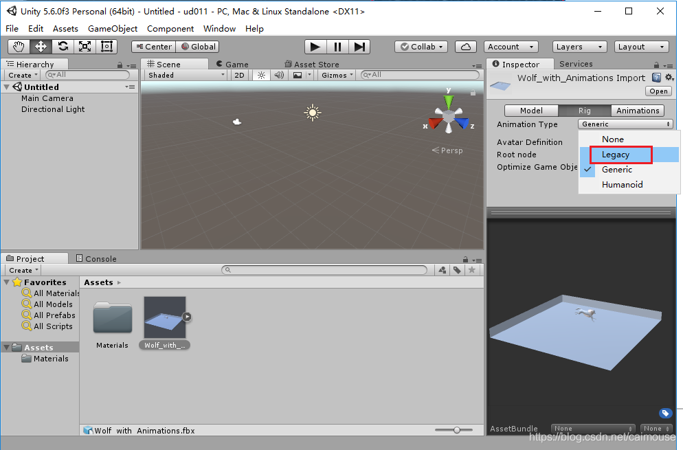 在Animation Type里点击选择框,弹出下拉列表,然后可以看到当前打勾的是Generic类型动画,我们要把它改为Legacy类型动画,如下图所示:
