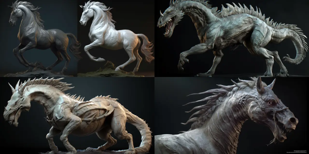 创造一个由马和龙组成的令人惊叹的混合生物,特别注意两种形式之间的融合,并确保肌肉组织保持可信。雕刻(ZBrush、Blender)。