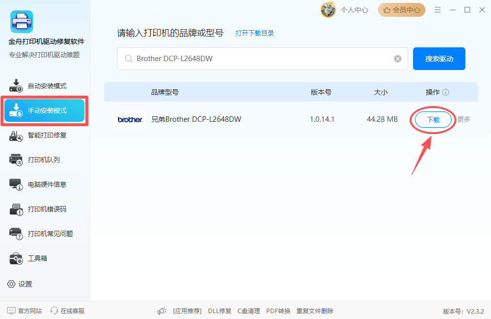 步骤4:手动安装模式:精准定位Brother打印机驱动。若你的打印机是网络连接或未被自动识别,可切换至手动模式:在软件顶部搜索栏输入 “Brother DCP-L2648DW”,系统会从百万级驱动库中筛选出对应型号的所有版本,选择与你的系统匹配的驱动点击下载即可。