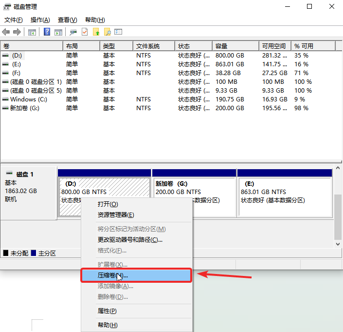 - 在磁盘管理中,右键点击要压缩的分区(如D盘),选择“压缩卷”。