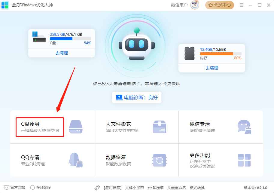 其实遇到C盘爆红不必急于扩容,先清理垃圾文件往往能释放几十GB空间,轻松化解燃眉之急,这里可以借助金舟Windows优化大师,软件支持C盘/全盘清理瘦身,磁盘碎片清理,微信清理,QQ清理,浏览器缓存清理,大文件搬家,电脑加速专属软件,轻松解决C盘爆红问题。