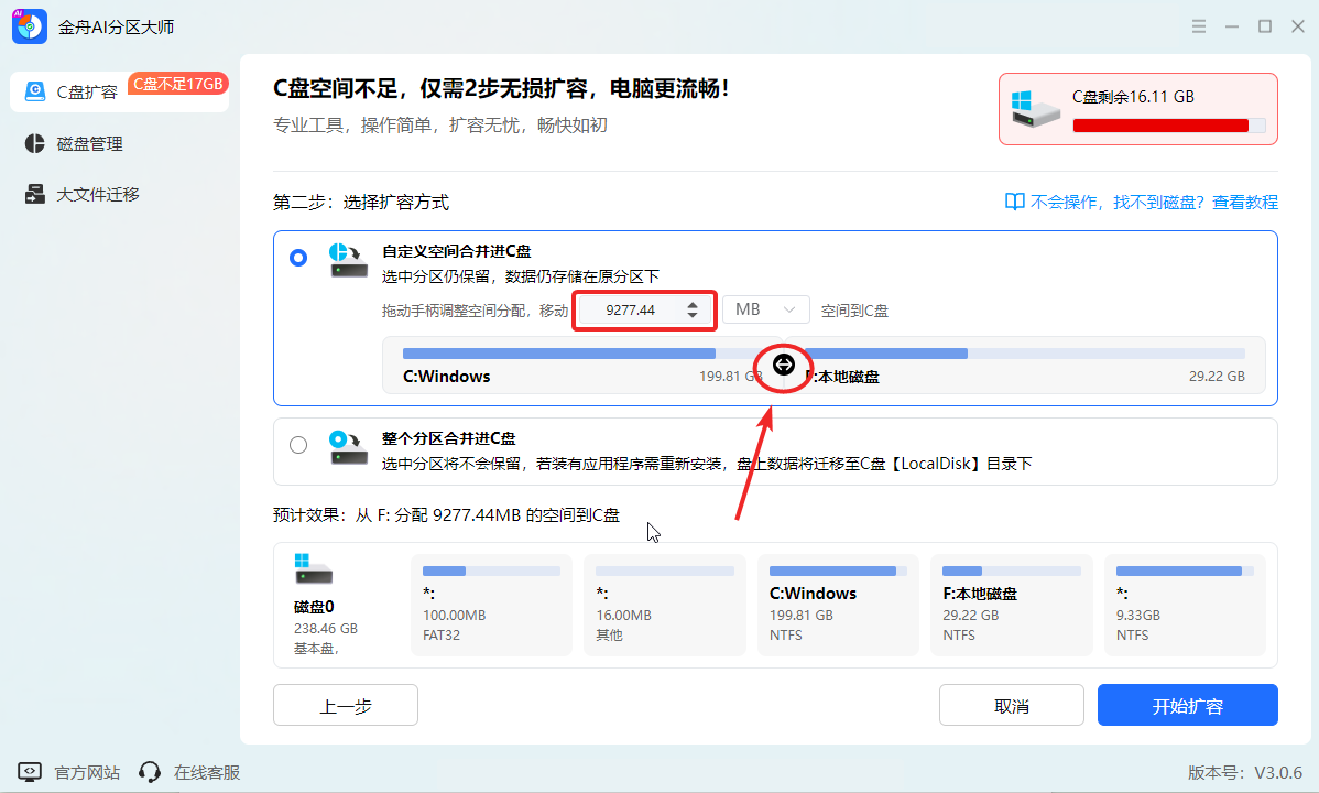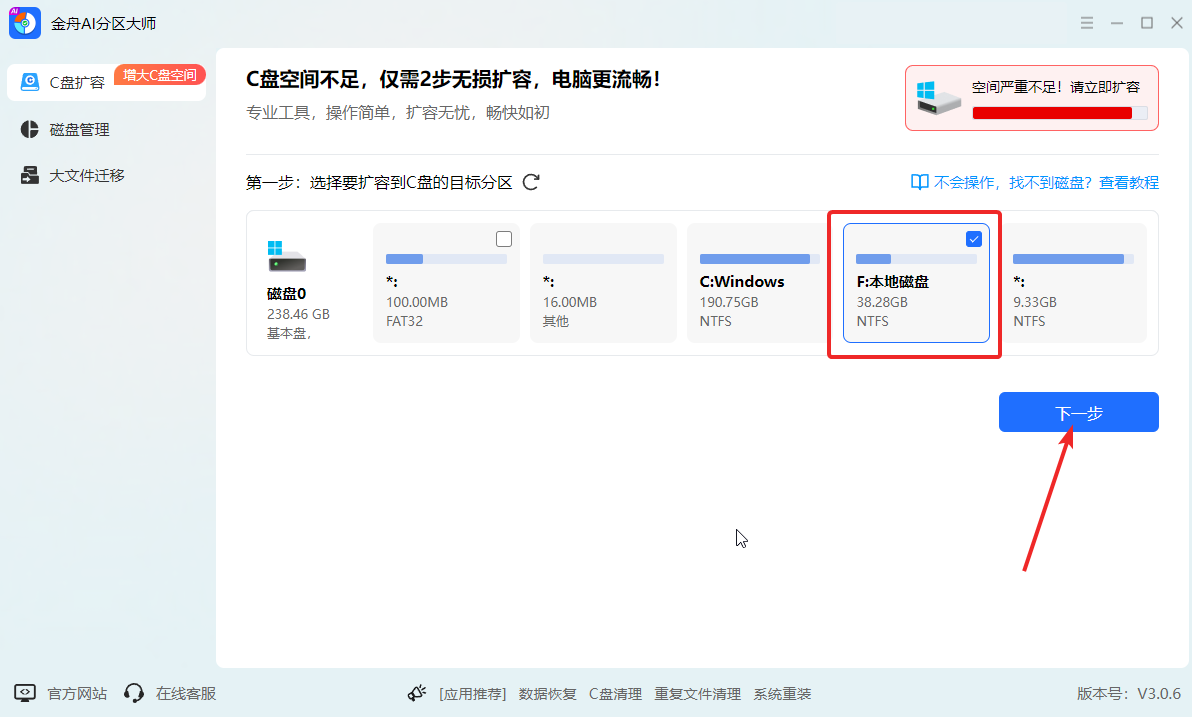 步骤一:电脑打开金舟AI分区大师,选择C盘扩容,系统自动扫描磁盘状态,确认扩容方案:软件会显示可分配给C盘的空闲空间(如F盘剩余30GB),点击【下一步】