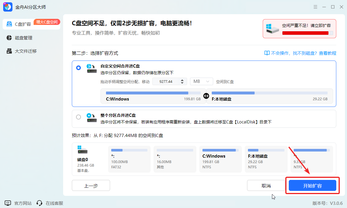 步骤三:点击【开始扩容】,接下来等待C盘扩容完成就可以了。