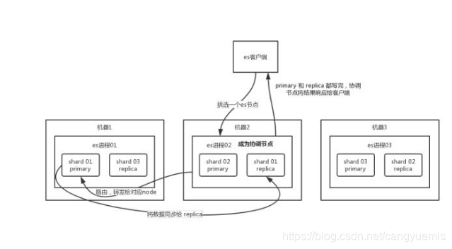 coordinate node。 coordinate node对doc id进行哈希路由,将请求转发到对应的 node,此时会使用round-robin随机轮询算法,在primary shard以及其所有 replica 中随机选择一个,让读请求负载均衡。- 接收请求的 node 返回 document 给